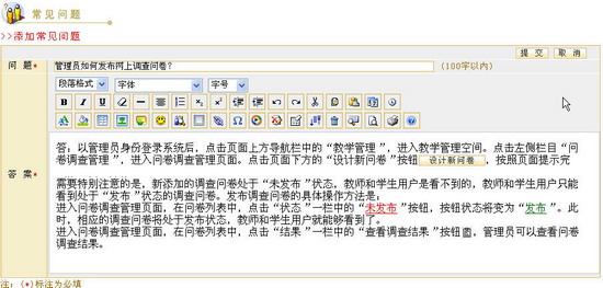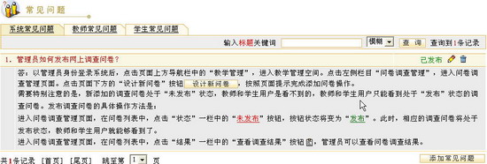 新添加的问题都处于未发布状态,未发布的问题不能被院系管理员所浏览。若要改变问题的发布状态,只需点击问题题目右侧的“未发布”或“已发布”功能键,系统常见问题的状态就可以在 “已发布”或“未发布”状态之间切换。