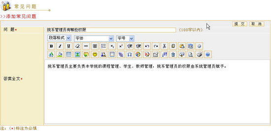 点击系统常见问题题目右侧的编辑图标 ,进入常见问题编辑页面,对常见问题题目和内容进行编辑后,点击“提交”按钮即可。