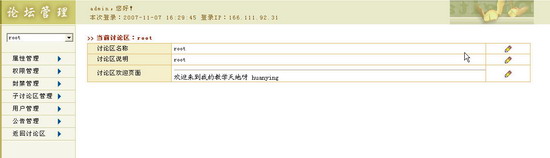网上论坛管理网上论坛管理包含了针对讨论区和用户的各种管理功能。 系统管理员具备管理权限,可对各讨论区的基本属性、用户权限、用户封禁、子讨论区、论坛公告、用户等进行管理。页面上方显示欢迎信息、本次登陆时间和登陆IP信息。 属性管理属性管理提供对讨论区基本属性的编辑修改功能。基本属性包括:讨论区名称、讨论区说明、讨论区欢迎页面。具备当前讨论区管理权限的用户可设定讨论区基本属性。属性管理界面如下图所示: 图 1 属性管理属性管理包括讨论区名称、讨论区说明和讨论区欢迎页面的修改: