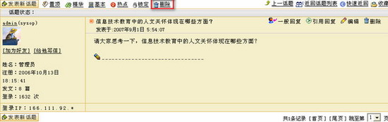 删除话题的操作比较简单,只需点击话题内容上方的“删除”功能键即可删除该话题及其下面的回复内容。