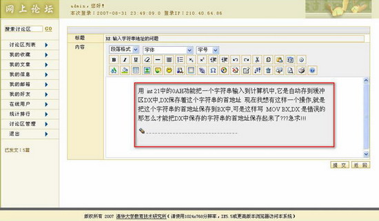 第三步:编辑文章标题和内容。回复标题默认为“RE:原文章名”,用户也可以修改回复标题。内容区域中灰色背景的区域为原文章的内容,用户可以在其中添加回复内容,也可以在空白区域编辑。