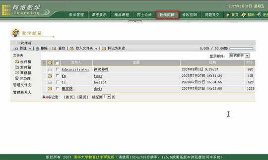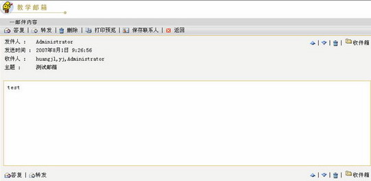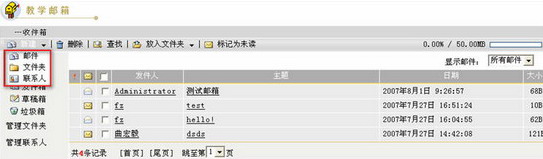教学邮箱由收件箱、发件箱、草稿箱、垃圾箱等组成。同时,教学邮箱为用户提供了管理文件夹和管理联系人的功能。