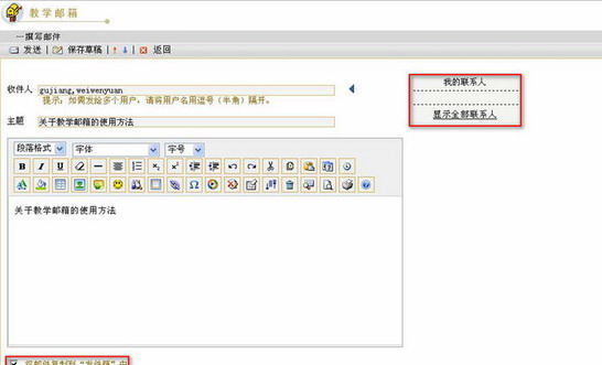 第五步:点击页面上方的“发送”功能键  ,发送该邮件。点击“保存草稿”功能键  ,将邮件保存到草稿箱。点击“重要性为高”图标  或“重要性为低”图标  可以对邮件的重要性进行标记。点击“返回”功能键  ,返回教学邮箱首页面。