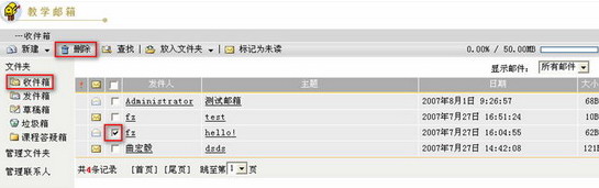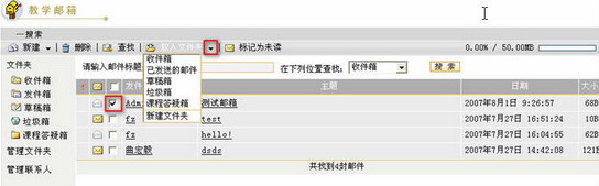 第一步:进入教学邮箱页面,点击文件夹列表中的“收件箱”,进入收件箱邮件列表页面,如下图所示:
