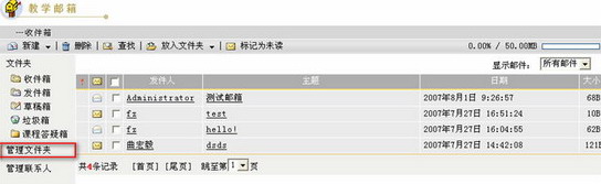 第一步:进入教学邮箱页面,点击页面左侧的“管理文件夹”链接,进入管理文件夹页面。