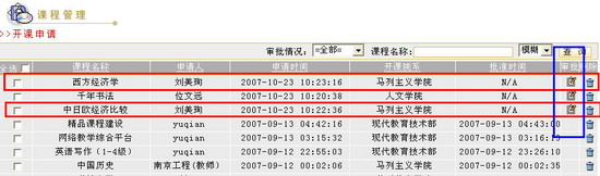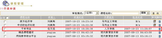 点击待审批课程右侧所对应的“审批” 图 2 指定课程编号点击“确定”按钮,完成审批操作,系统给出“成功加入课程”的提示信息: 图 3 课程添加成功需要说明的是,对于已经完成审批注册的课程,在开课申请列表中仍然会保留其开课申请记录,您可以在“批准时间”一列中查看课程的审批注册日期,当然,由于这些课程已完成审批注册,所以在“审批”一列中,您将无法看到“审批” 图 4 已经完成注册的课程删除课程点击已审批注册课程所在行的“删除” 图 5 取消并删除开课申请 |
