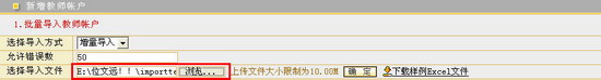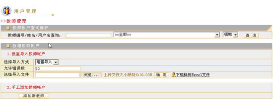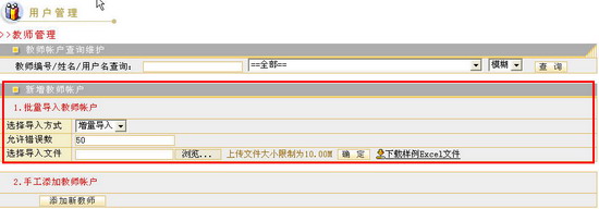选择完毕,点击 按钮,系统会给出成功导入用户数据的提示信息。管理员可以在教师用户列表中查看批量导入的用户信息。 需要说明的是,如果您在批量导入用户的Excel文件中所填写的教师用户名与系统已经注册的教师用户名发生重复时,系统将提供两种不同的导入方式――“增量导入”和“覆盖导入”供您选择。“增量导入”方式将不允许发生重复的数据再次被导入系统中,对于这部分重复数据系统会给出用户已存在,无法导入的提示信息。“覆盖导入”方式则会以当前Excel文件中新的教师用户数据来替换系统中已经注册的、用户名发生重复的这部分教师用户数据。 “允许错误数”是指管理员在执行批量导入过程中,所填写的Excel文件中,不符合导入数据要求的最大用户记录数。例如,系统默认允许错误数为50,这也就意味着,您所填写的批量导入用户Excel文件中,如果存在50条以内的不规范数据记录,批量导入是可以正常完成的,系统将导入其他所有规范数据,不规范数据记录是无法导入的。导入完成后,对于无法导入的数据记录,系统将给出相应的提示信息