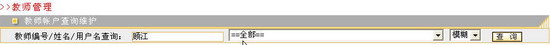 教师用户的查询有两种方式,一种是精确,一种是模糊。您在“教师编号/姓名/用户名查询”框内输入您所要查询的关键词,所输入的关键词可以是教师编号、教师姓名或教师用户名。系统会根据这个信息列出能匹配的教师用户。例如,查询姓名为“顾江”的教师用户,点击“查询”按钮后,将列出所有符合查询条件的教师用户。