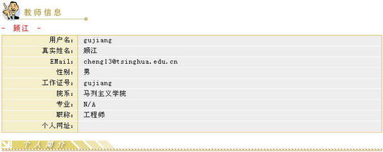 如果要浏览教师用户的信息,请在用户列表中点击任何一个教师用户的教师姓名,如点击“顾江”这个教师用户,即可在弹出的窗口浏览该教师用户的个人信息。