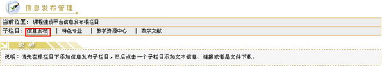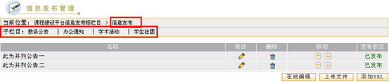 内容管理在内容管理中,系统管理员可以对各栏目中的信息发布进行管理,您可以添加、修改、删除信息,并可以改变信息排列顺序、设置信息发布状态。 添加信息进入内容管理页面(图1) ,选择信息发布所在的栏目。当前位置为课程建设平台信息发布根栏目,在根目录下不能添加内容,您可以点击进入某个子栏目(图2),进入一级目录的栏目信息内容管理中。如果该栏目下面还有子栏目,您可以继续选择二级目录的子栏目(图3),以此类推,直至进入需要发布信息的栏目的信息内容管理页面。 图 1 一级目录信息发布管理 图 2 一级目录信息发布管理 图 3 二级目录信息发布管理 编辑内容在任一子栏目的信息内容管理页面,都提供了三种信息发布方式。