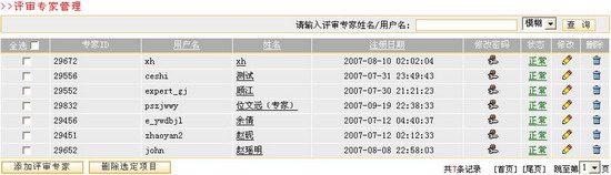 查询评审专家用户在页面上方查询栏目中输入要查询评审专家的姓名或用户名,选择模糊或精确查询方式,点击 用户排列评审专家列表中的用户信息可以分别按照“用户名”和“真实姓名”两个字段排序罗列。点击列表区域上端的热键“用户名”或“真实姓名”,即可按照评审专家用户名或姓名中第一个字母在字母表中的先后顺序进行排列。 修改密码点击评审专家列表中某一用户所在行的“修改密码”图标 切换状态点击列表中某一评审专家用户所在行的“状态”列对应的“正常”或“暂停”功能键,即可实现用户状态在“暂停”与“正常”之间的相互切换。 修改用户信息点击列表中某一评审专家用户所在行的“修改”图标 查看评审专家用户信息点击评审专家列表中某一用户的姓名,在弹出的用户信息窗口中可以浏览该用户的用户名、姓名、E-mail、性别和研究领域等信息。 |