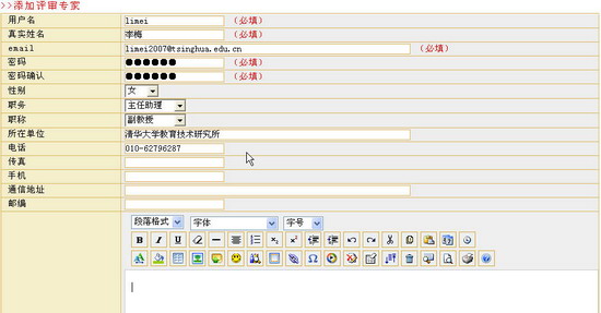 评审专家用户管理添加评审专家用户欢迎进入对外汉语教学平台!教师或学生登录后,可以使用教与学支持系统、网上社区系统、个人工具系统所提供的功能进行教或学。教学管理员登录以后,可以使用教学管理系统提供的功能进行教学管理。 图 1 添加评审专家用户输入要添加评审专家的用户名、真实姓名、E-mail、密码和密码确认信息,点击 图 2 添加评审专家用户页面·带 ·填写完毕之后,如果点击