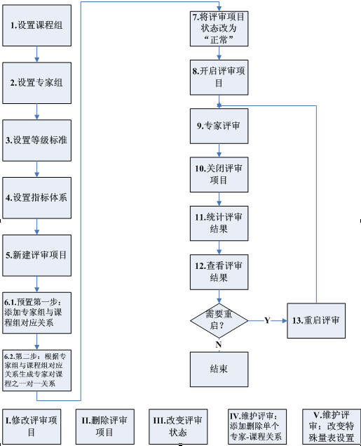 评审项目管理管理员可以对评审项目进行管理,包括新建、修改、删除评审项目,评审状态设置,评审结果查看以及评审功能管理。 评审项目管理的一般流程是:管理员建立并且开启评审项目;预置的评审专家对参评课程进行评审;评审结束后,课程管理员对评审结果进行统计。具体如图所示。 评审项目管理的一般流程 图 1 评审管理流程图在图中,自I到V为其他操作。说明如下: