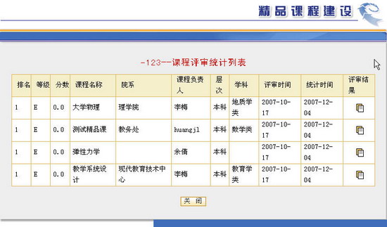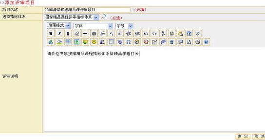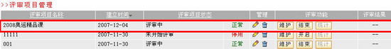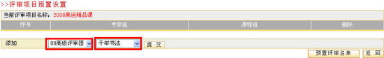 具体操作如下: 图 2 评审项目管理新建评审项目在评审项目管理页面,点击评审项目列表下方的 按钮,进入添加评审项目页面,在此页面设置相关选项并点击 按钮即可创建新的评审项目。 图 3 新建评审项目页面预置评审项目新建一个评审项目完毕后,点击 首先预置评审项目的内容,主要包括两部分,一是选择评审该项目的专家组,二是选择该评审项目所包含的课程组,选择完毕后点击 然后点击 图 4 评审项目预置 图 5 显示刚添加的专家组和课程组 图 6 管理评审名单开启评审项目点击 图 7 处于评审状态的评审项目结束评审项目在专家评审完精品课程之后,管理员可以点击该评审项目对应的 查看评审项目统计信息在结束该评审项目之后,点击 图 8 查看评审结果信息重起评审项目如果在一个评审项目结束后,如果发现某位专家还没有评审某一门精品课程,那么管理员可以点击 |