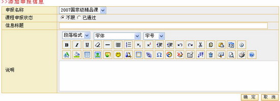 管理员用户可以在“申报消息”栏目中选择某一次的申报项目并加上信息标题和说明文字发布出去。此申报信息发布出去之后,访客便可在系统的首页看到该信息,包括信息的标题、说明文字和此次申报的课程列表。
