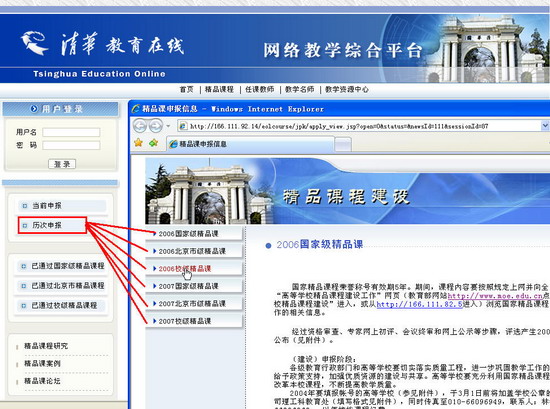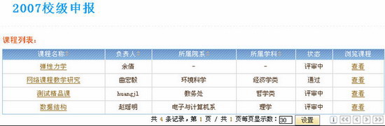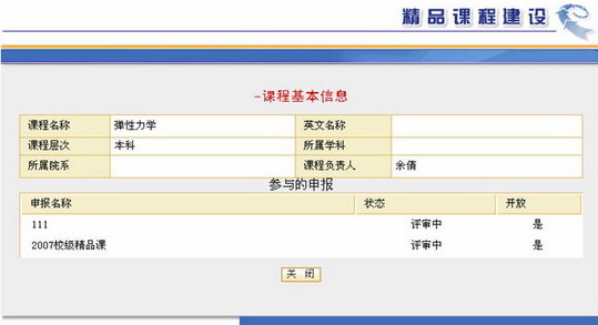 在首页中点击“历次申报”进入申报信息页面,点击某一申报信息的“查看”图标 ,将弹出申报信息展示页面,在此页面用户可以查看该申报项目下的所有课程信息。