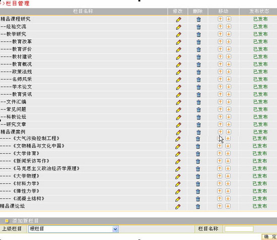 选择“精品课研究”栏目下的“栏目管理”选项将切换至“栏目管理”页面,管理员在此可以增加、删除和修改信息模块中的栏目。具体操作如下: