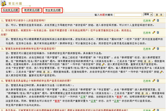 在系统常见问题页面的查询栏输入标题关键字,选择“精确”或“模糊”查询方式,如图所示,点击“确定”按钮,查询结果如图所示。